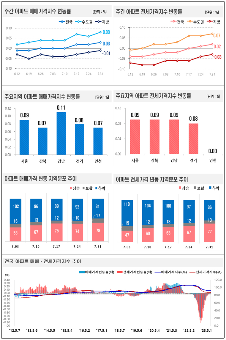 한국부동산원이 2023년 7월 5주(7.31일 기준) 전국 주간 아파트가격 동향을 조사한 결과, 매매가격은 0.03% 상승, 전세가격은 0.02% 상승을 기록했다.