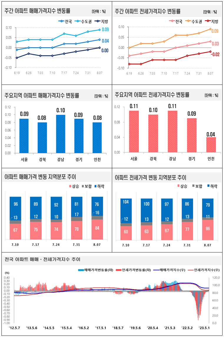 한국부동산원이 2023년 8월 1주(8.7일 기준) 전국 주간 아파트가격 동향을 조사한 결과, 매매가격은 0.04% 상승, 전세가격은 0.03% 상승을 기록했다.